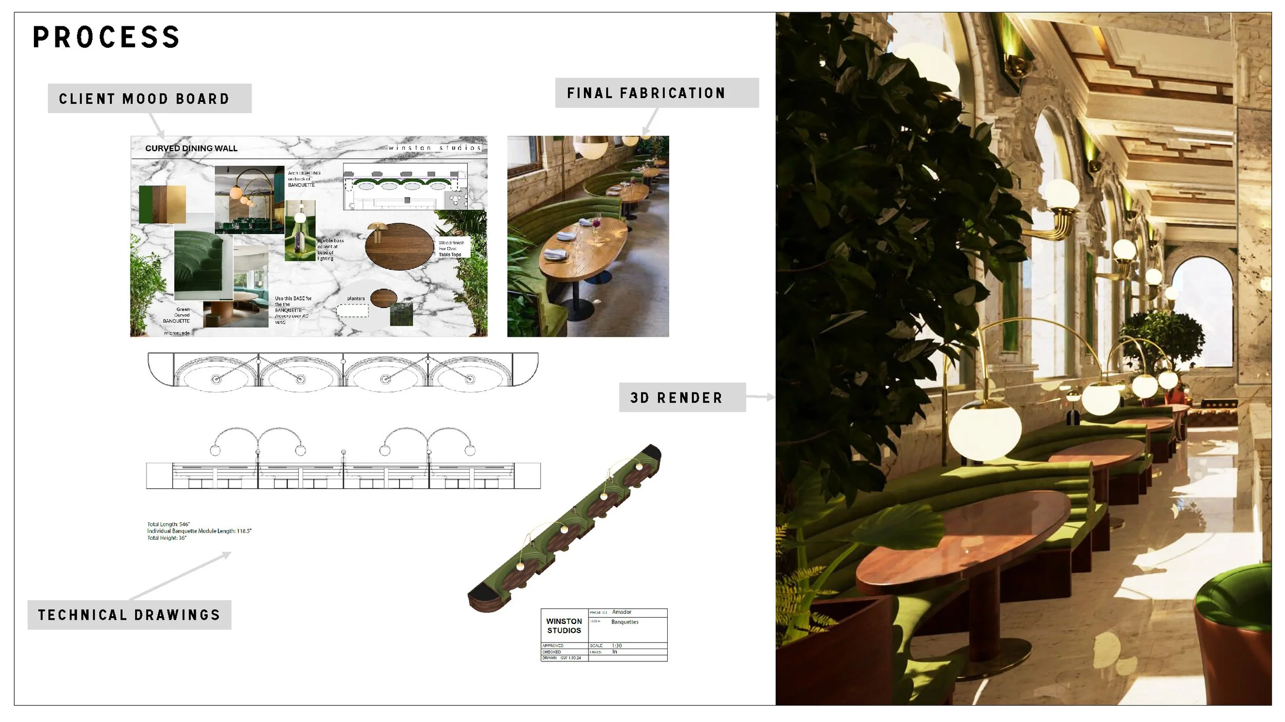 Develop 3D models and 2D technical drawings for all custom furniture and built-in elements throughout the 3,500 sq ft space