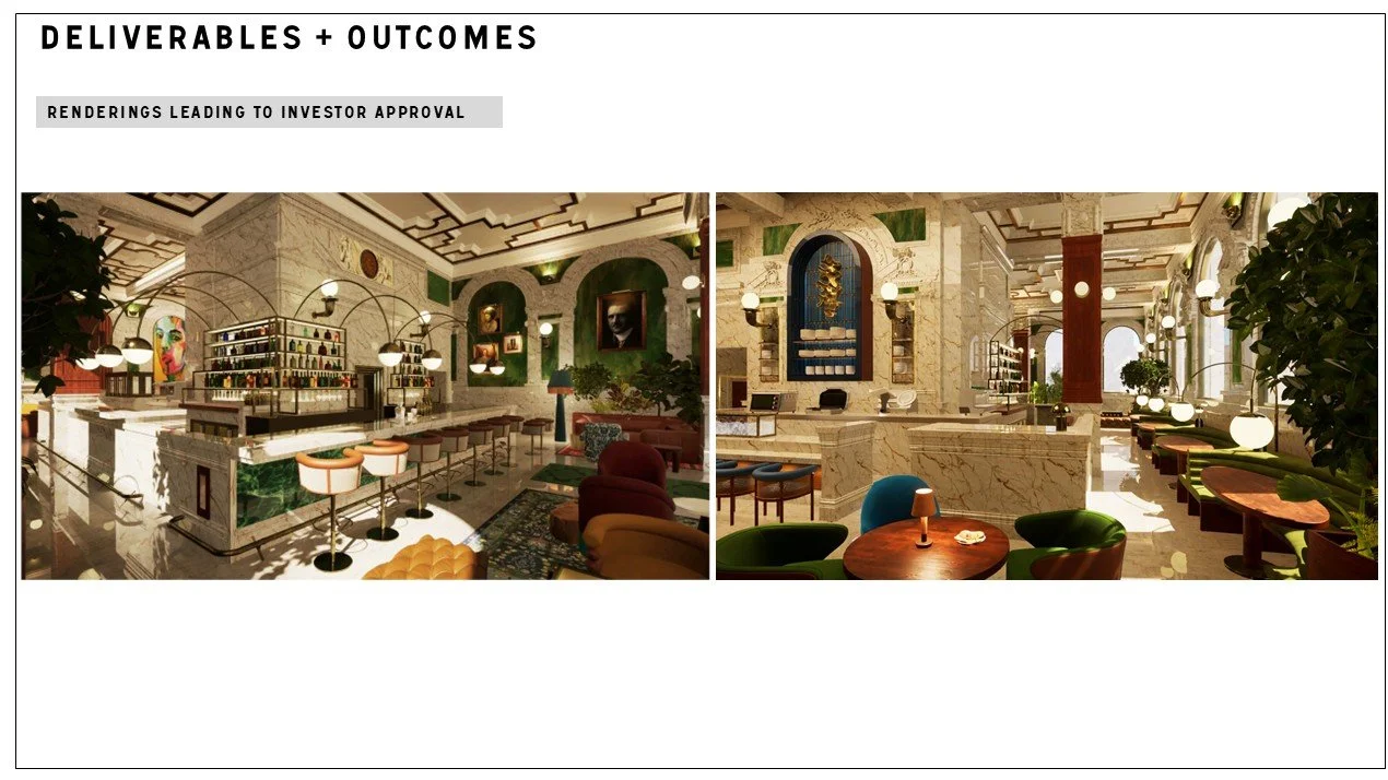 I led all digital modeling and visualization for the project—producing investor-ready renderings, developing marketing assets, and creating technical drawings for custom furniture and built-ins.